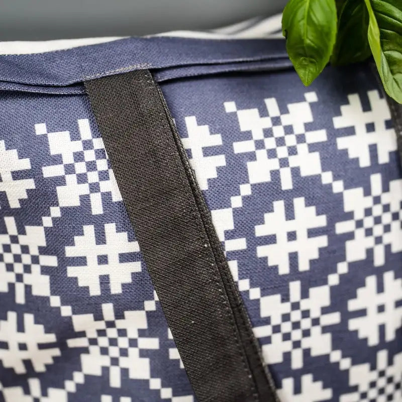 Lina ja puuvillase segu kangast kotid kollektsioonist „Etnograafilised mustrid“, mille kujundustes on kasutatud traditsioonilisi eesti kindakirju ja rahvuslikke ornamente erinevatest Eesti piirkondadest. Iga muster peegeldab Eesti rahva kultuuri ja ajaloo rikkust, ühendades iidseid käsitöötraditsioone tänapäevase funktsionaalse disainiga. Kotid on ühtaegu stiilsed, vastupidavad ja jätkusuutlikud, muutes need suurepäraseks aksessuaariks igapäevaks või eriliseks kingituseks.