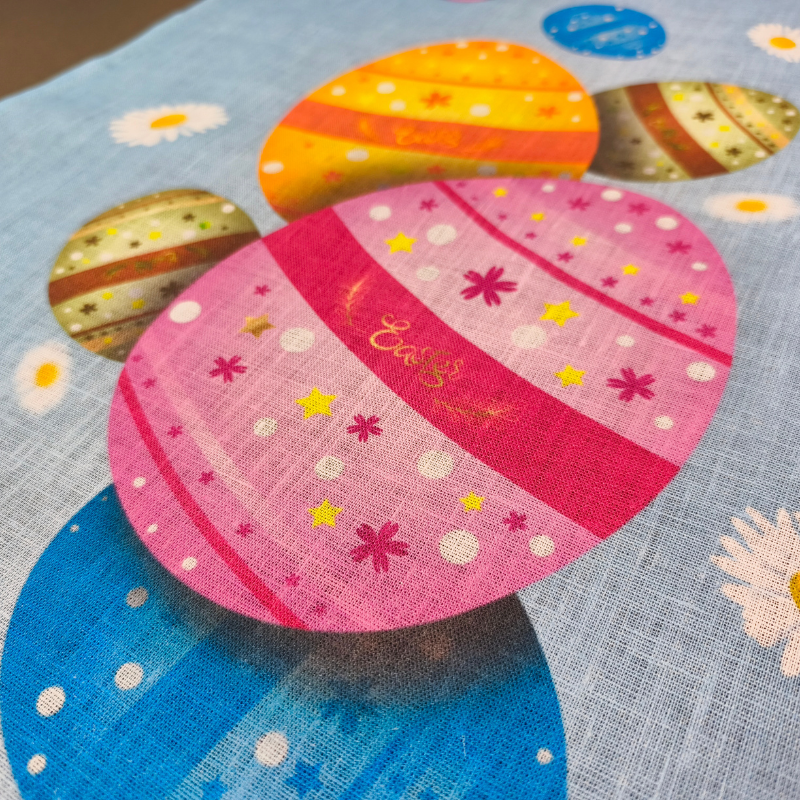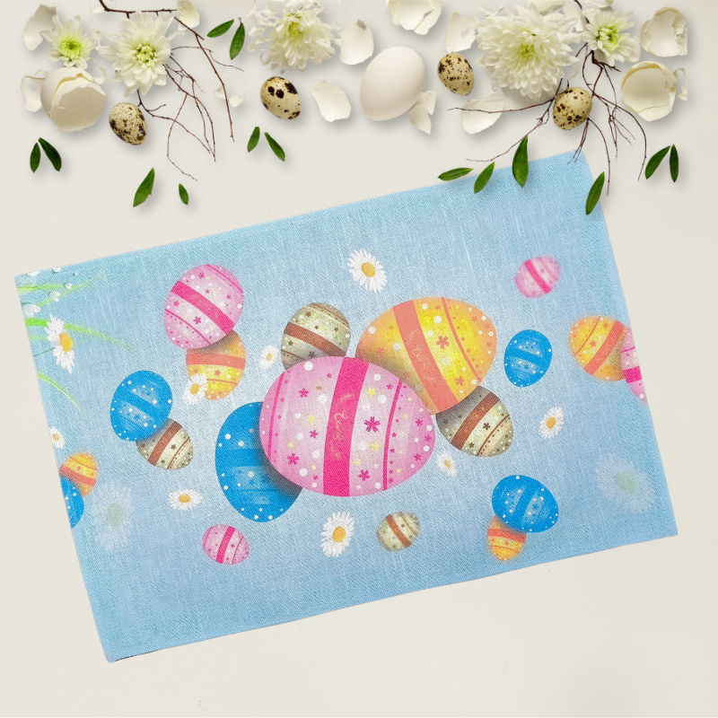 Dzīvespriecīgs lina dvielis ar spilgti krāsotām svētku olām uz gaiši zila, pavasarīgu debesu fona. Olu ripināšana un krāsošana ir svarīgākā pavasara tradīcija, un šis virtuves piederums to lieliski atspoguļo. Praktisks, izturīgs un skaists akcents, kas palīdzēs radīt īstu svētku gaisotni.